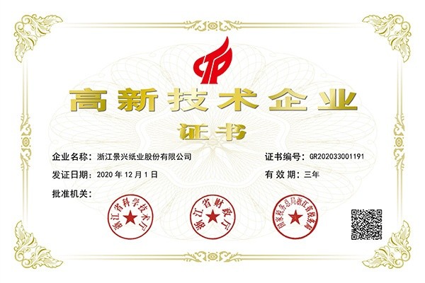 2011.09.景興紙業首次獲得國家“高新技術企業”證書。